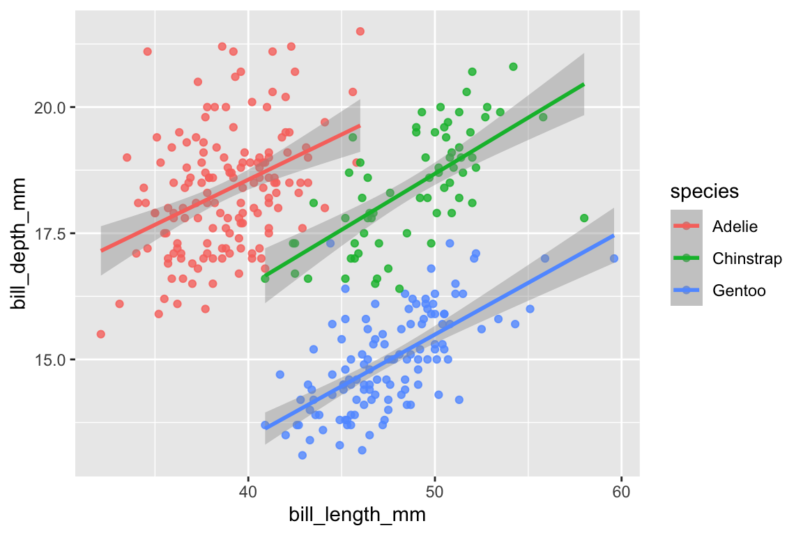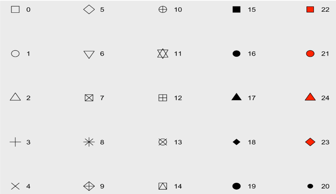 aes()) (a.k.a. mapping)x, y: variablescolour: colours the lines of geometriesfill: fill geometries or fill colorgroup: groups based on the datashape: shape of point, an integer value 0 to 24, or NAlinetype: type of line, a integer value 0 to 6 or a stringsize: sizes of elements, a non-negative numeric valuealpha: changes the transparency,a numeric value 0 to 1